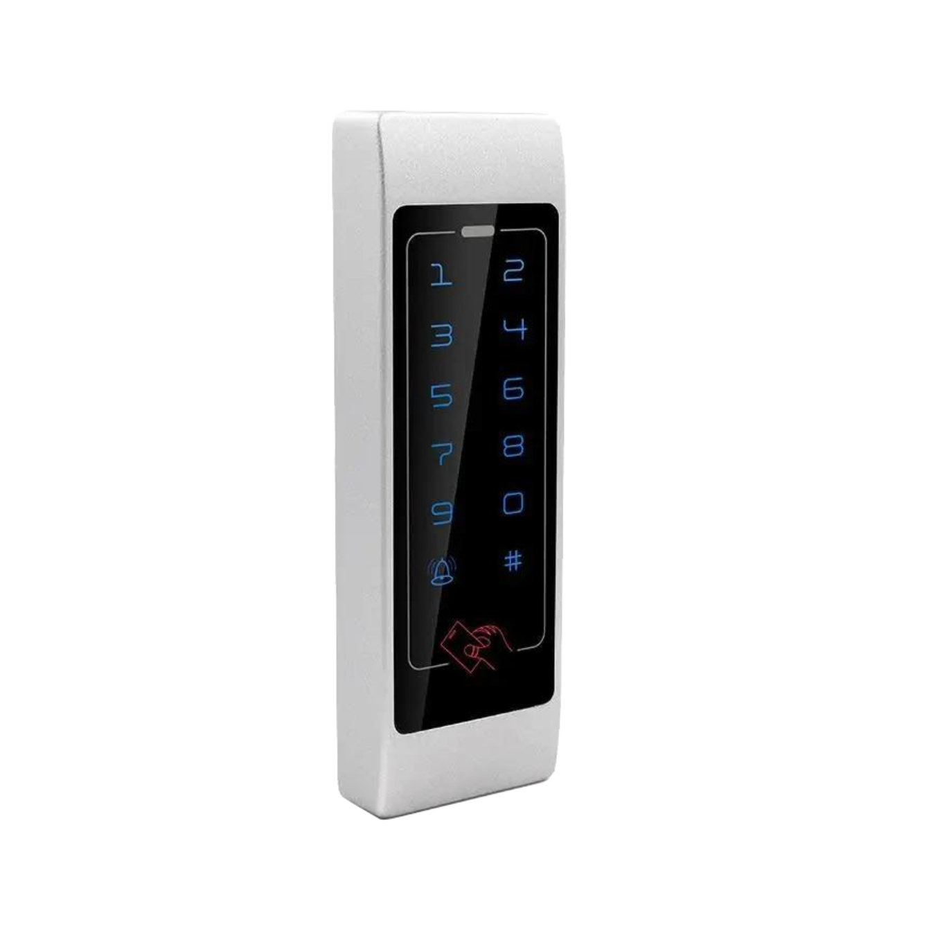 Автономная сенсорная клавиатура/контроллер доступа (СКУД) со встроенным считывателем карт и брелоков EM-Marine (125 kHz). Имеет подсветку клавиатуры, способ разблокировки: код, карта. Данная автономная сенсорная клавиатура предназначена для установки в помещении.