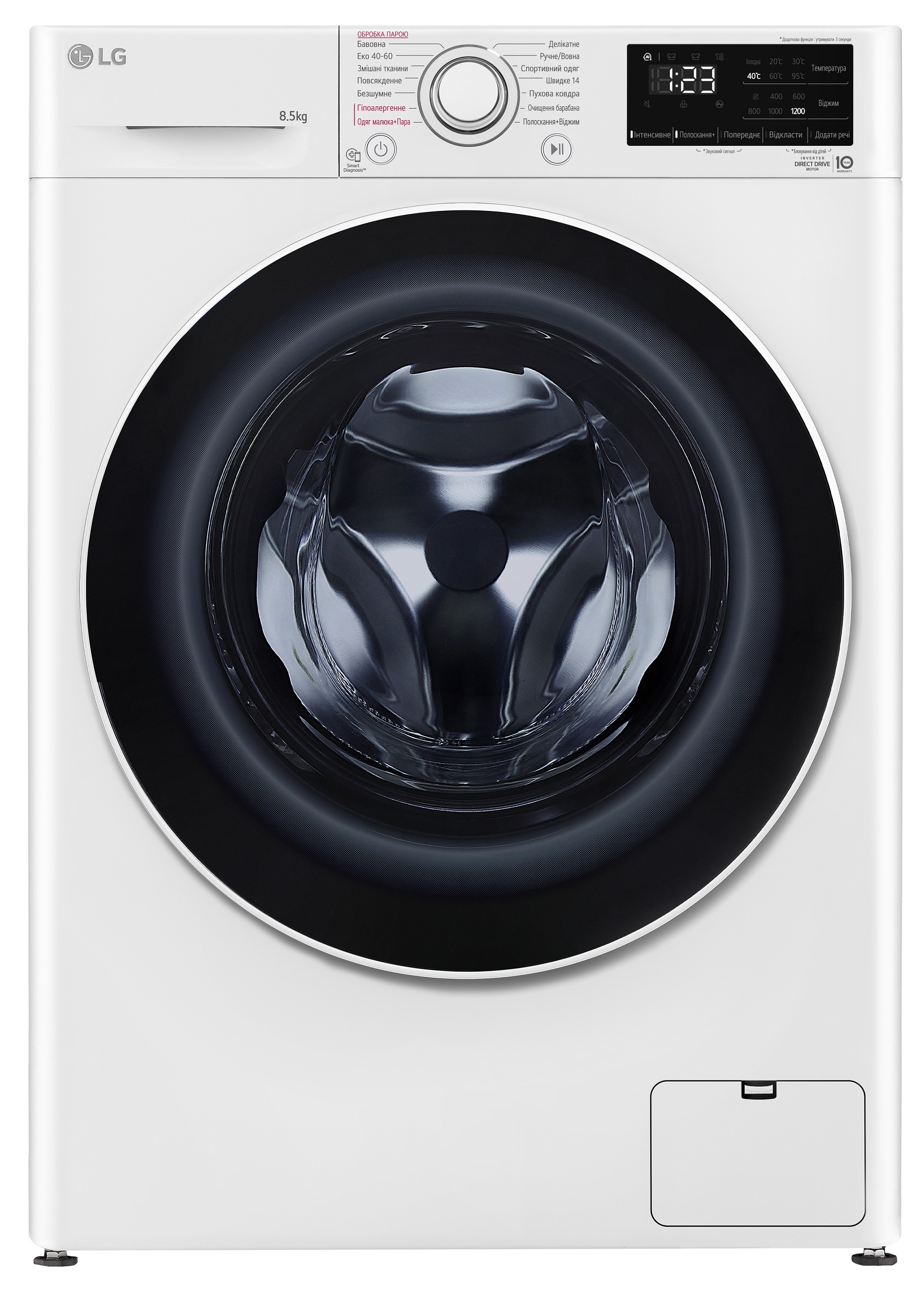 Пральна машина, Фронт. Завантаження 8.5 кг, Клас енергоефективності А+++, Макс. швидкість віджиму 1200 об/хв, Об'єм барабану 58 л, Матеріал бака Надміцний ABS-пластик, Матеріал ТЕНа Спеціальний сплав нікелюмід, Тип двигуна Inverter Direct Drive, К-сть програм 14, Макс потужність 2100 Вт, Рівень шуму прання/віджим 54/71 Дб