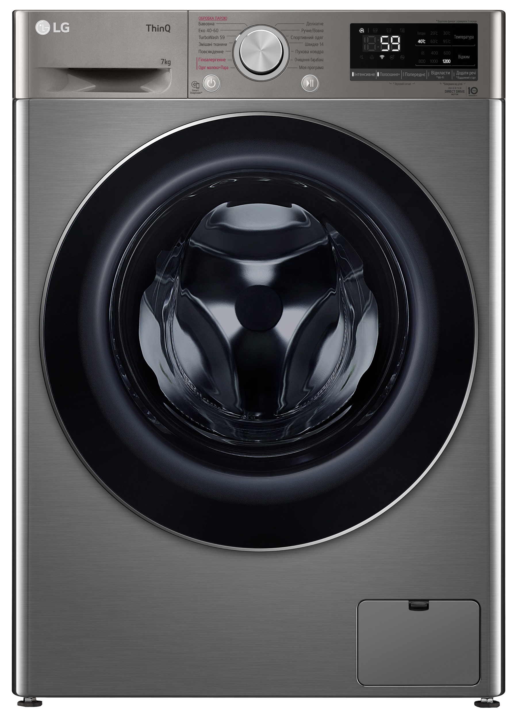Пральна машина, Фронт. Завантаження 7 кг, Клас енергоефективності А+++, Макс. швидкість віджиму 1200 об/хв, Об'єм барабану 44 л, Матеріал бака Надміцний ABS-пластик, Матеріал ТЕНа Спеціальний сплав нікелюмід, Тип двигуна Inverter Direct Drive, Віддалене керування через додаток LG ThinQ по Wi-Fi, К-сть програм 14, Макс потужність 2100 Вт, Рівень шуму прання/віджим 56/71 Дб